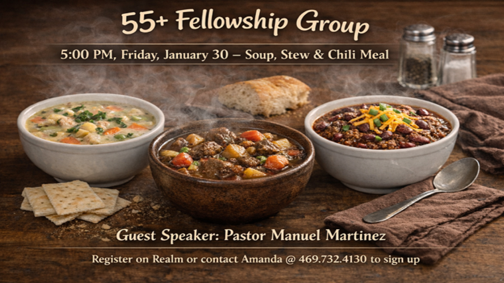Are you 55 or older? Then this gathering is for you! Our very own Pastor Manuel will be our guest speaker on Friday, January 30, at 5:00 pm in the Rotunda. We will be enjoying soups, stews, and chili! Be sure to sign up on Realm to bring your dish, or text Amanda at 469.732.4130 to let her know what you are bringing.
