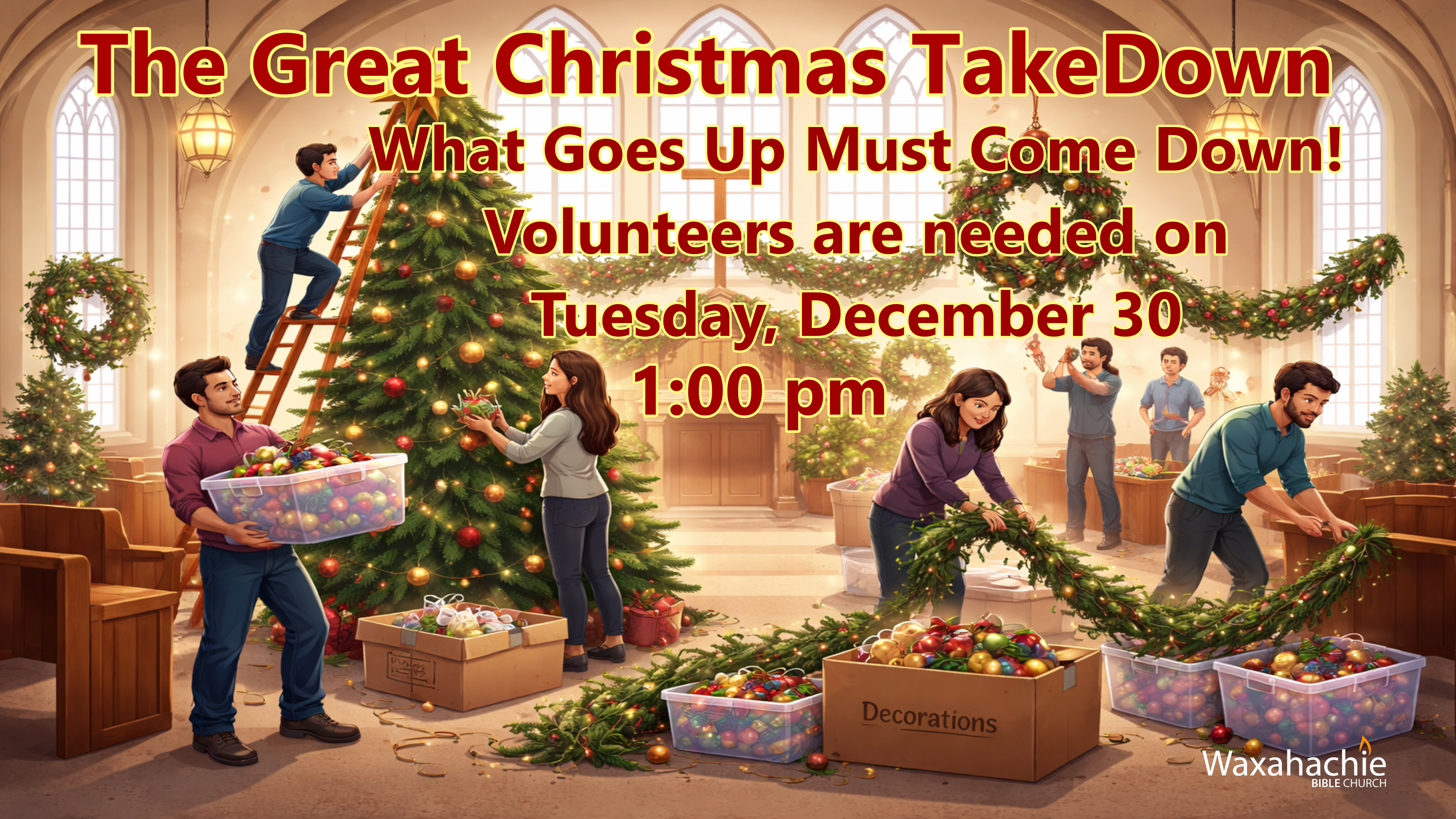 What goes up must come down! We need you Tuesday, December 30, at 1:00 pm, to help take down all of the Christmas decorations from the church and pack them away for next year! See y'all here!