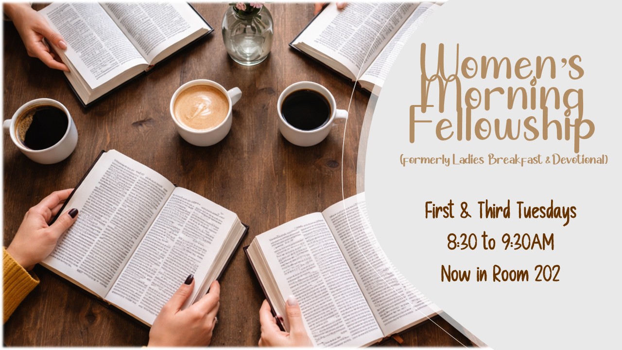 Women's Morning Fellowship is formerly Ladies Breakfast & Devotional. Instead of meeting at Chick-Fil-A, we will be meeting here at the church in room 202. Same days (first and third Tuesdays of the month) and same time (8:30-9:30 am). Looking forward to seeing you all at our new meeting place!