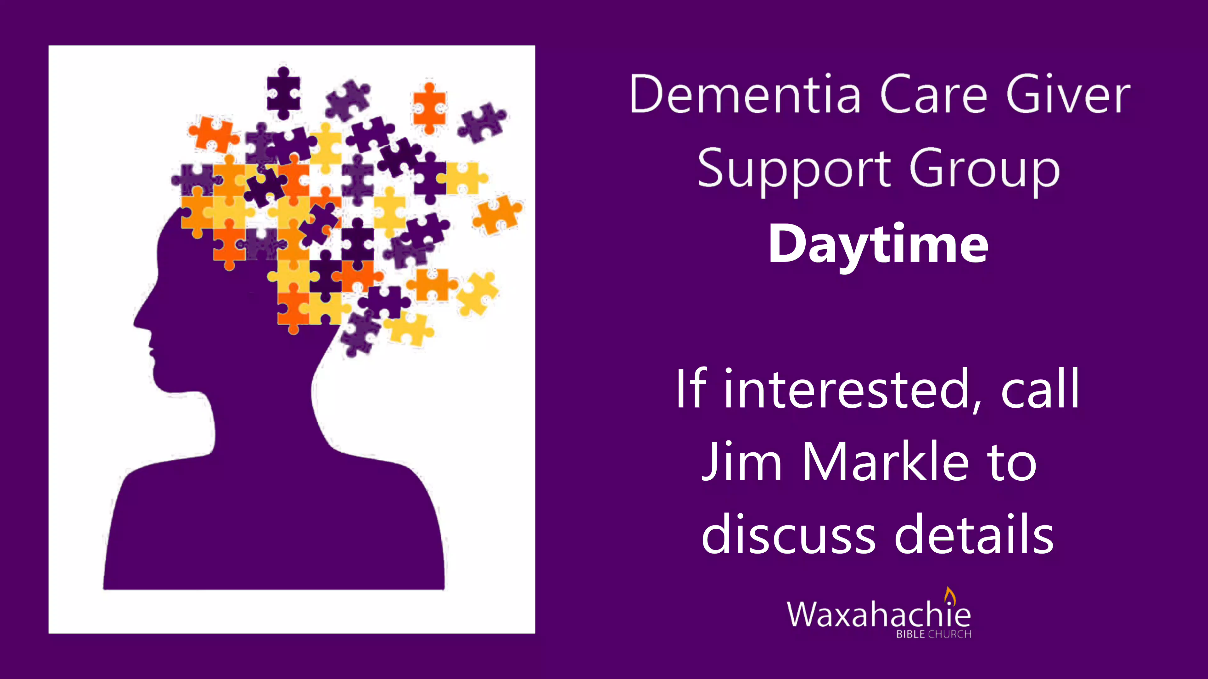 Dear Dementia Care Givers, We are thinking of beginning a DAYTIME support group (for those whose schedules prevent them from attending our evening group) in the very near future. If you are interested, please contact Jim Markle at 214.542.0489.