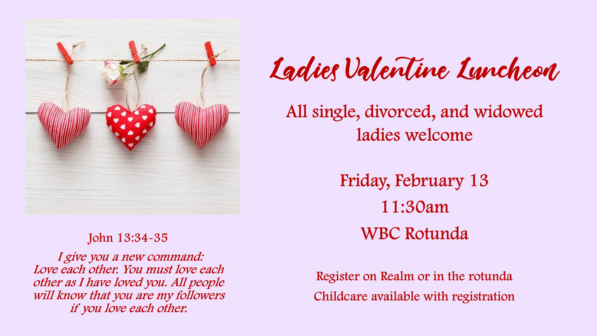 All single, divorced, and widowed ladies are cordially invited to join us for a Valentine luncheon on Friday, February 13, at 11:30 am, in the Rotunda. Our very own Elois Bryant is our special guest speaker! Although this is a free event, please register on Realm or Sundays in the Rotunda.