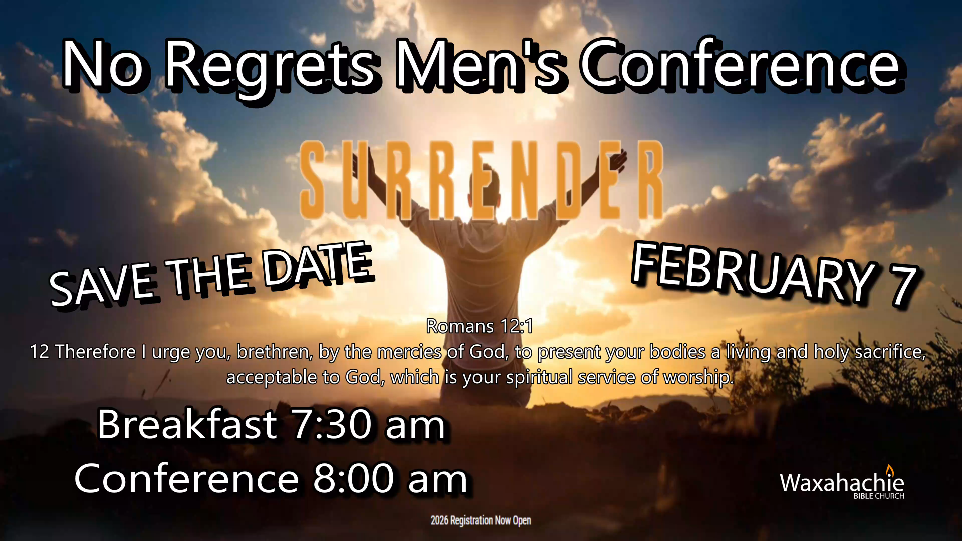 Men's No Regrets Annual Conference and Breakfast on Saturday, February 7, from 7:30 am to 3:00 pm. The theme is Surrender (how to surrender everything for Jesus). See Billy Smith to register by January 31 for only $10 - it will be $20 after that - so you will want to sign up as soon as possible!