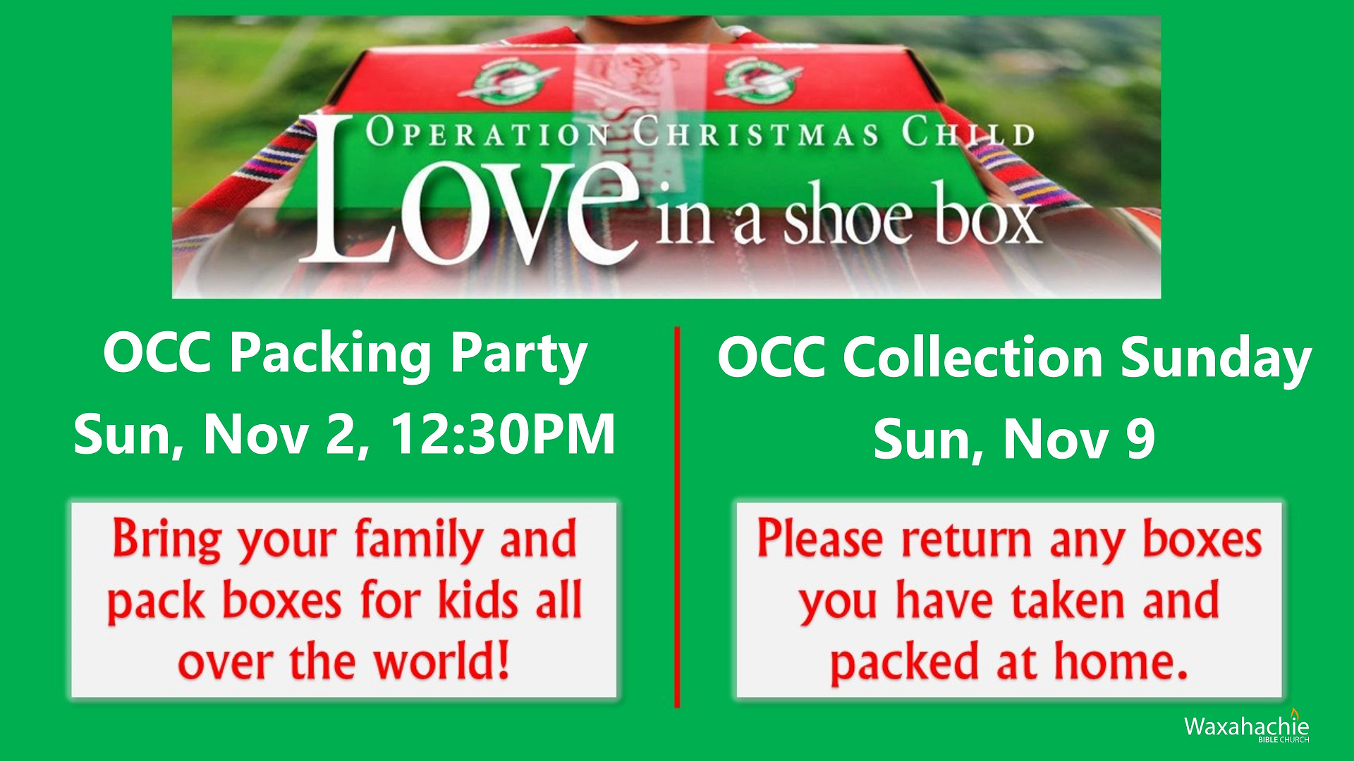 This is our annual Operation Christmas Child Packing Party - bring your family and help us pack gift shoeboxes for kids on Sunday, November 2, at 12:30 pm. Then don't forget to return shoeboxes you have taken and filled at home the following Sunday morning, November 9! Place them with all the others on the platform in the Auditorium.